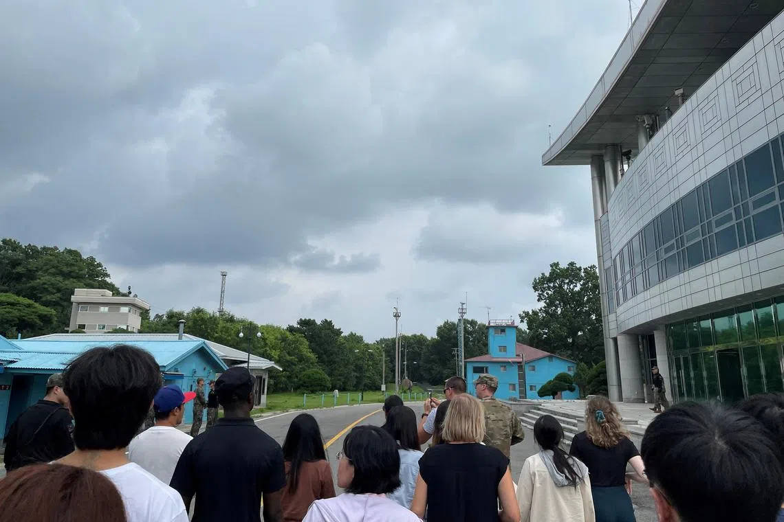 US Pte Travis King, wearing a black shirt and black cap, is pictured at the truce village of Panmunjom, South Korea, before making a break for the border with North Korea.