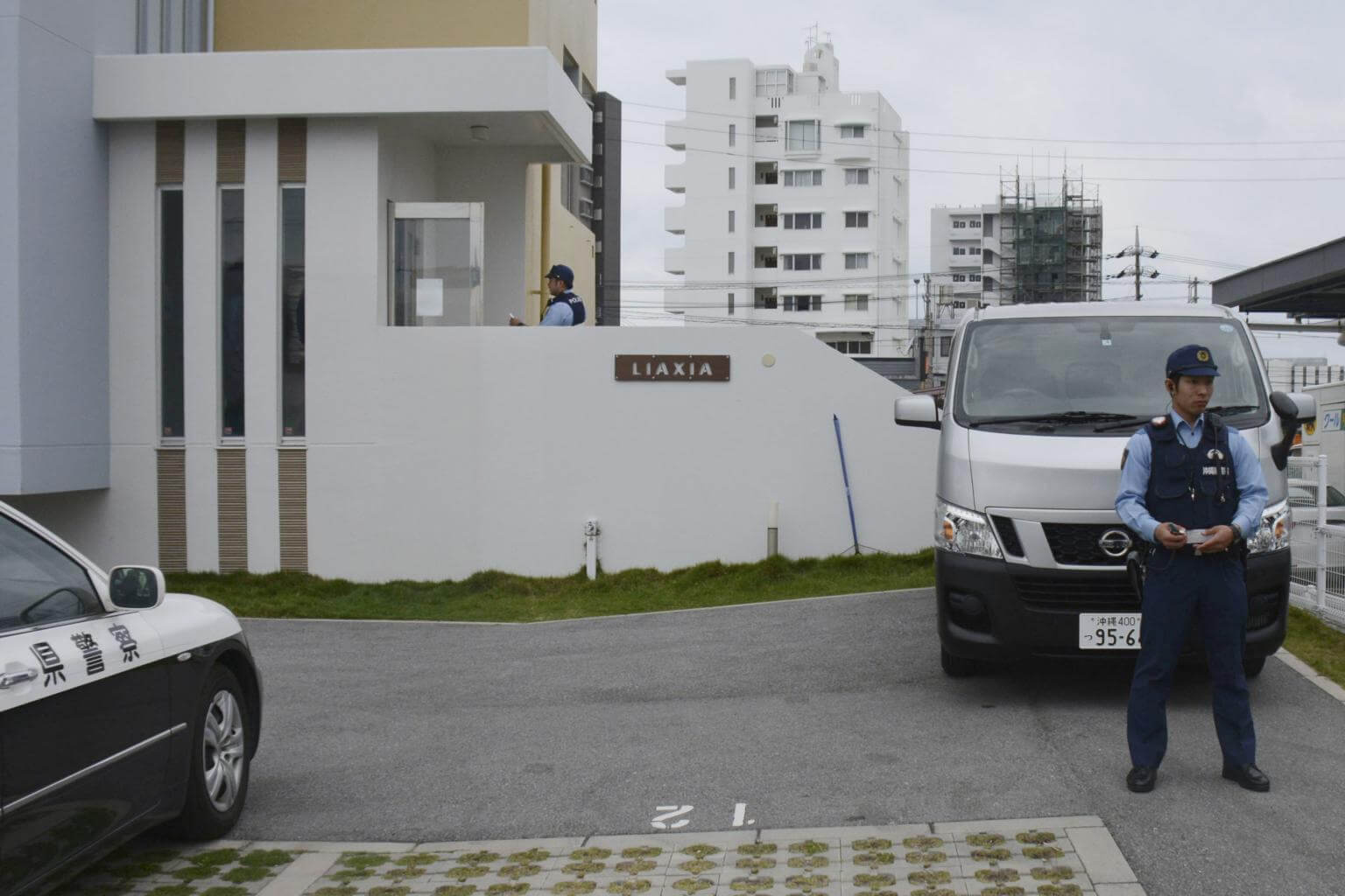 Japanese policemen stand in front of an apartment where a US Navy sailor and a Japanese woman were found dead in Okinawa, on April 13, 2019.