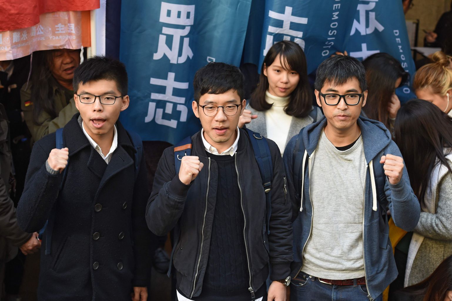 Democracy activists (from left) Joshua Wong, Nathan Law and Alex Chow face the media outside the Court of Final Appeal before their first appeal hearing against jail sentences in Hong Kong, on Jan 16, 2018.