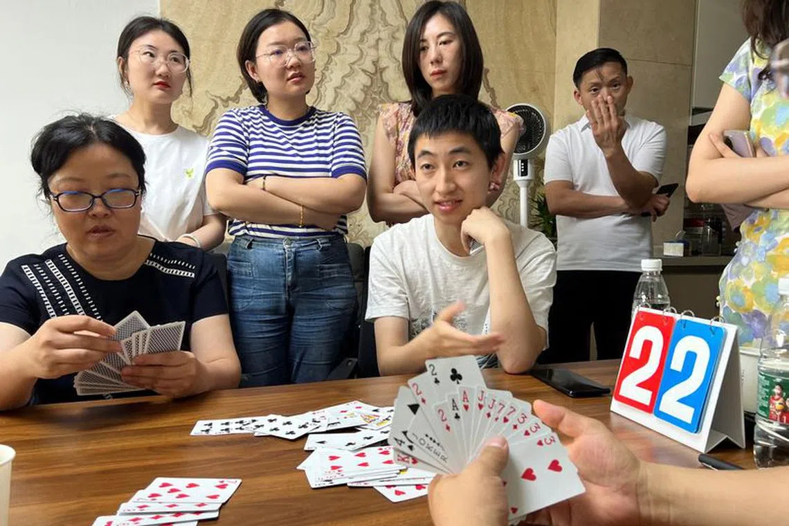 Finance professionals learning how to play Guandan, a poker-like card game, during a training session in Beijing, on Aug 6.