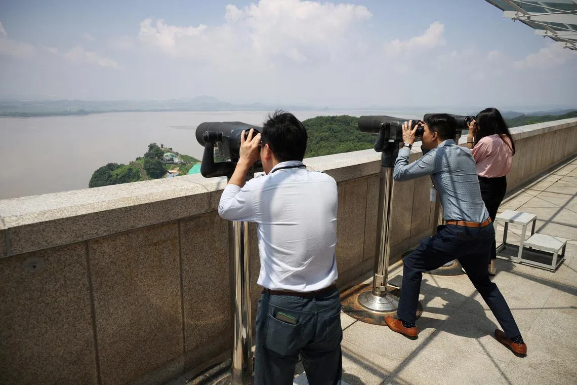 People looking at North Korea at an observation platform near the DMZ separating the two Koreas in Paju, South Korea, on July 19, 2023.