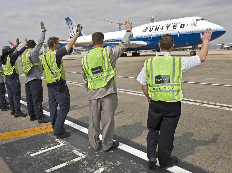 In this file photo taken on March 28, 2007, ground crew members wave goodbye to United Airlines flight 897 at Washington's Dulles International Airport as it leaves on its maiden non-stop 13-hour flight from Washington to Beijing.