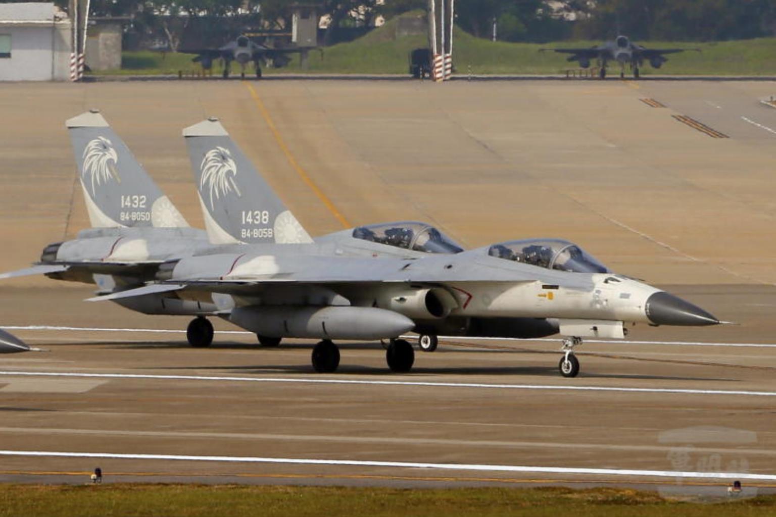 Two F-CK-1 warplanes at the Hualien Airbase in Hualien, eastern Taiwan, on June 4, 2018.