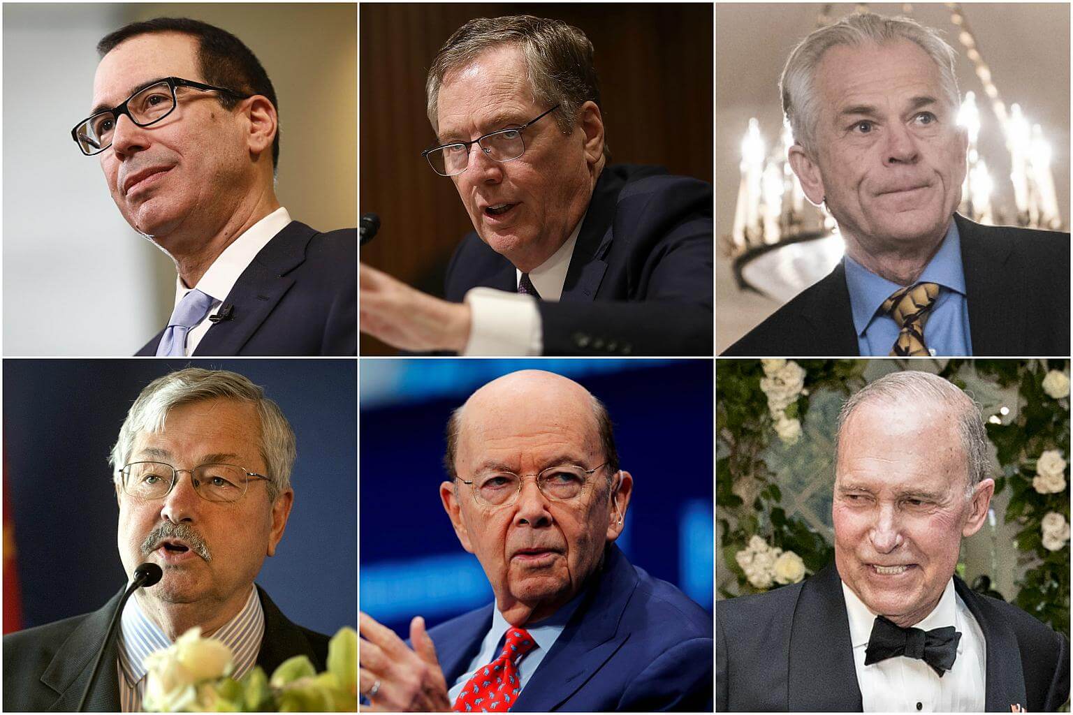 The high-level US trade delegation will be comprised of (clockwise from top left) Steven Mnuchin, Robert Lighthizer, Peter Navarro, Larry Kudlow, Wilbur Ross and Terry Branstad.