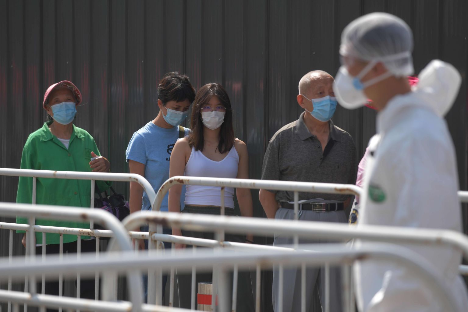 People wait in line to undergo coronavirus swab tests at a testing station in Beijing on June 30, 2020.