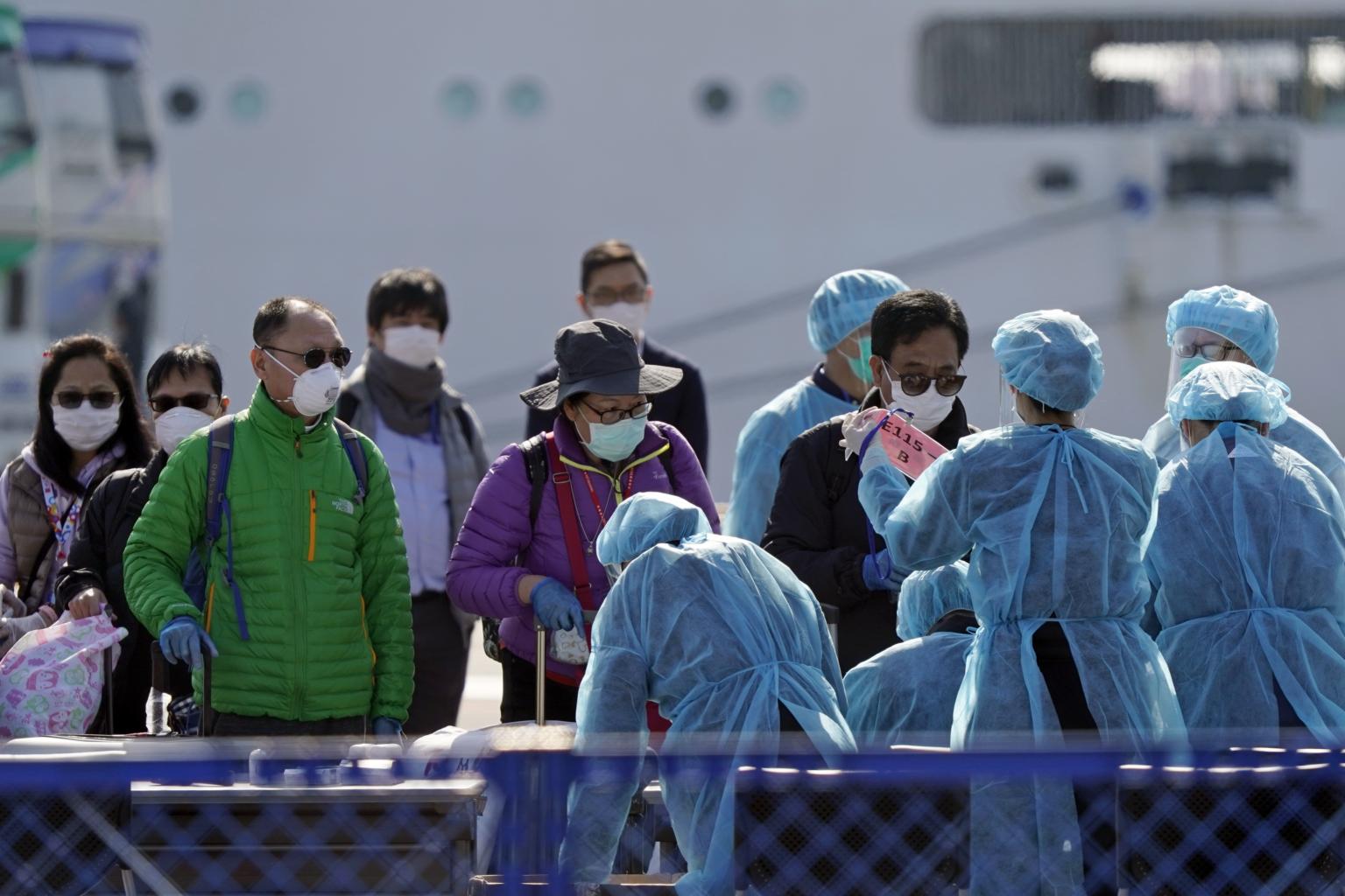 Workers in protective gear screening passengers as they disembark the Diamond Princess cruise ship at the Daikoku Pier Cruise Terminal in Yokohama, Japan, on Feb 21, 2020.