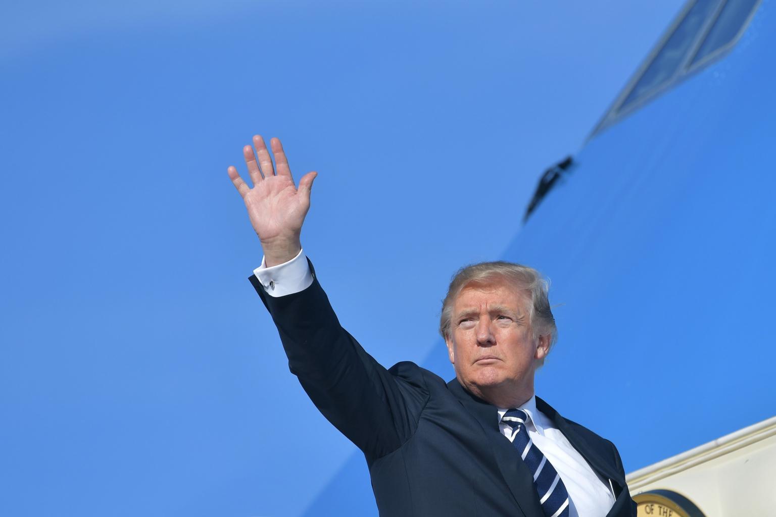 US President Donald Trump makes his way to board Air Force One at Andrews Air Force Base in Maryland, before departing for Greenville, South Carolina on Oct 16, 2017.