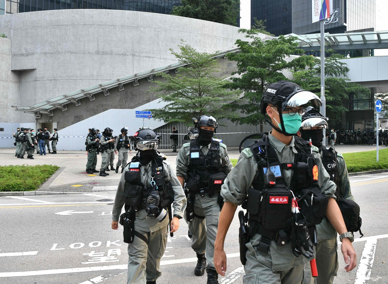 Riot police patrol outside the Legislative Council ahead of a debate over a law that bans insulting China's national anthem on May 27, 2020.