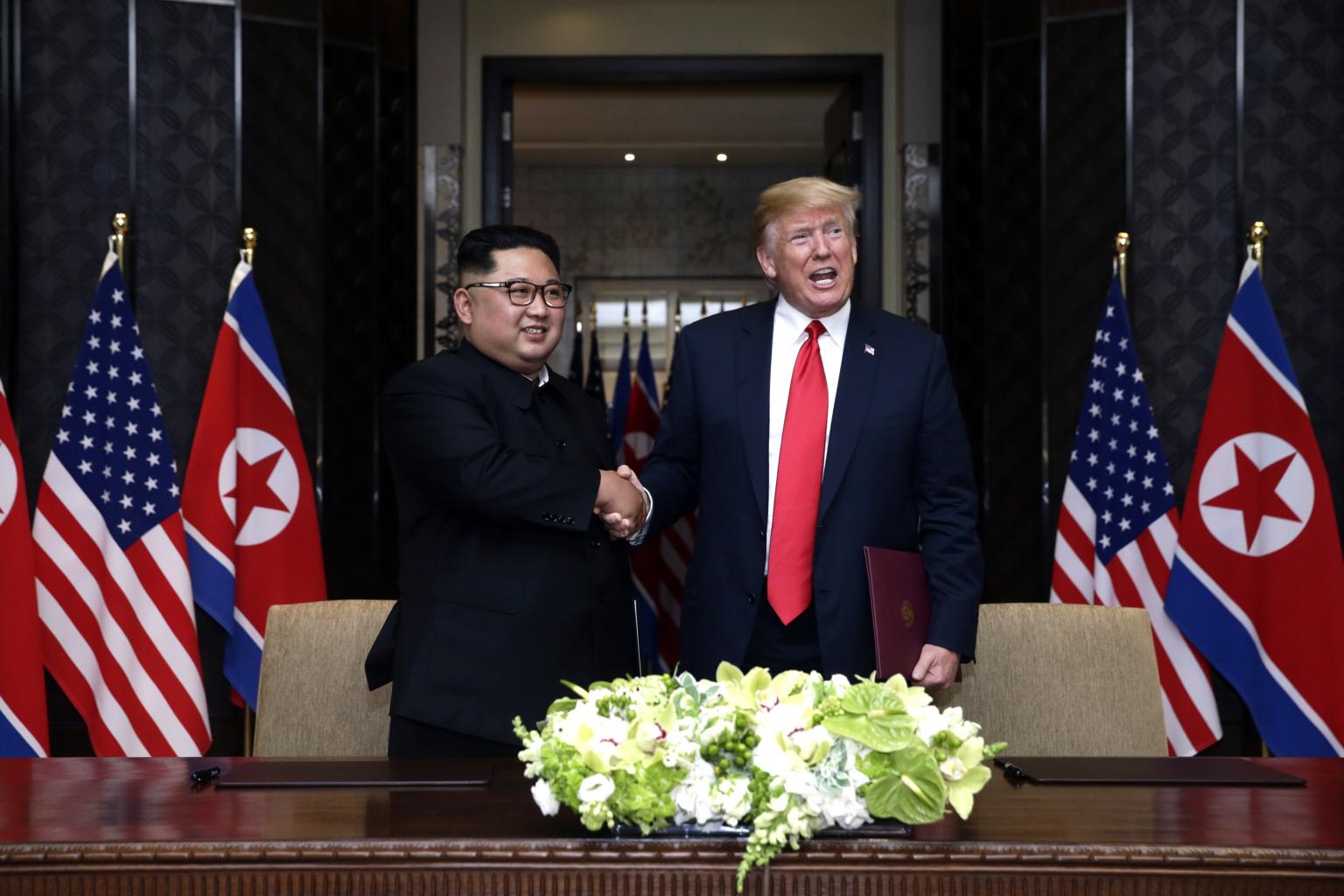 US President Donald Trump and North Korean leader Kim Jong Un at the historic summit at the Capella Singapore on June 12, 2018.