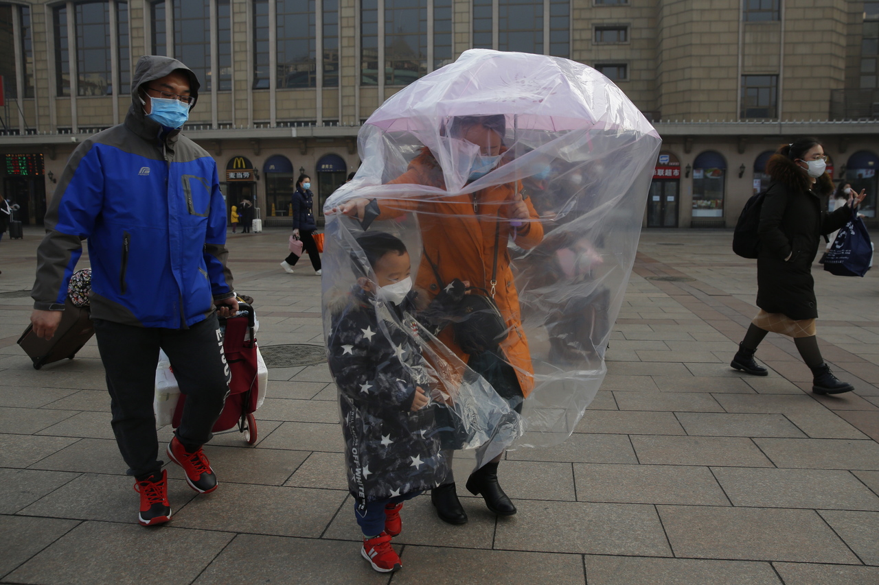 A passenger wears a protective mask and covers herself and her child with a plastic bag at the Beijing railway station on Feb 11, 2020.