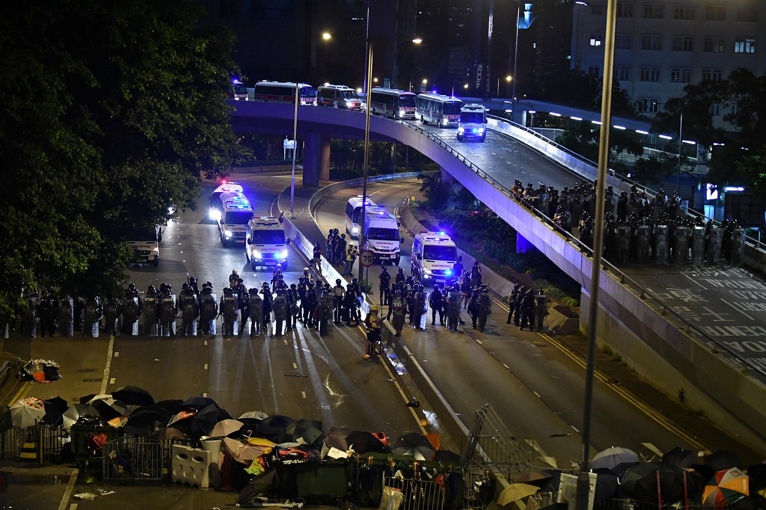 Police in riot gear on Harcourt Road after midnight on July 2, 2019.