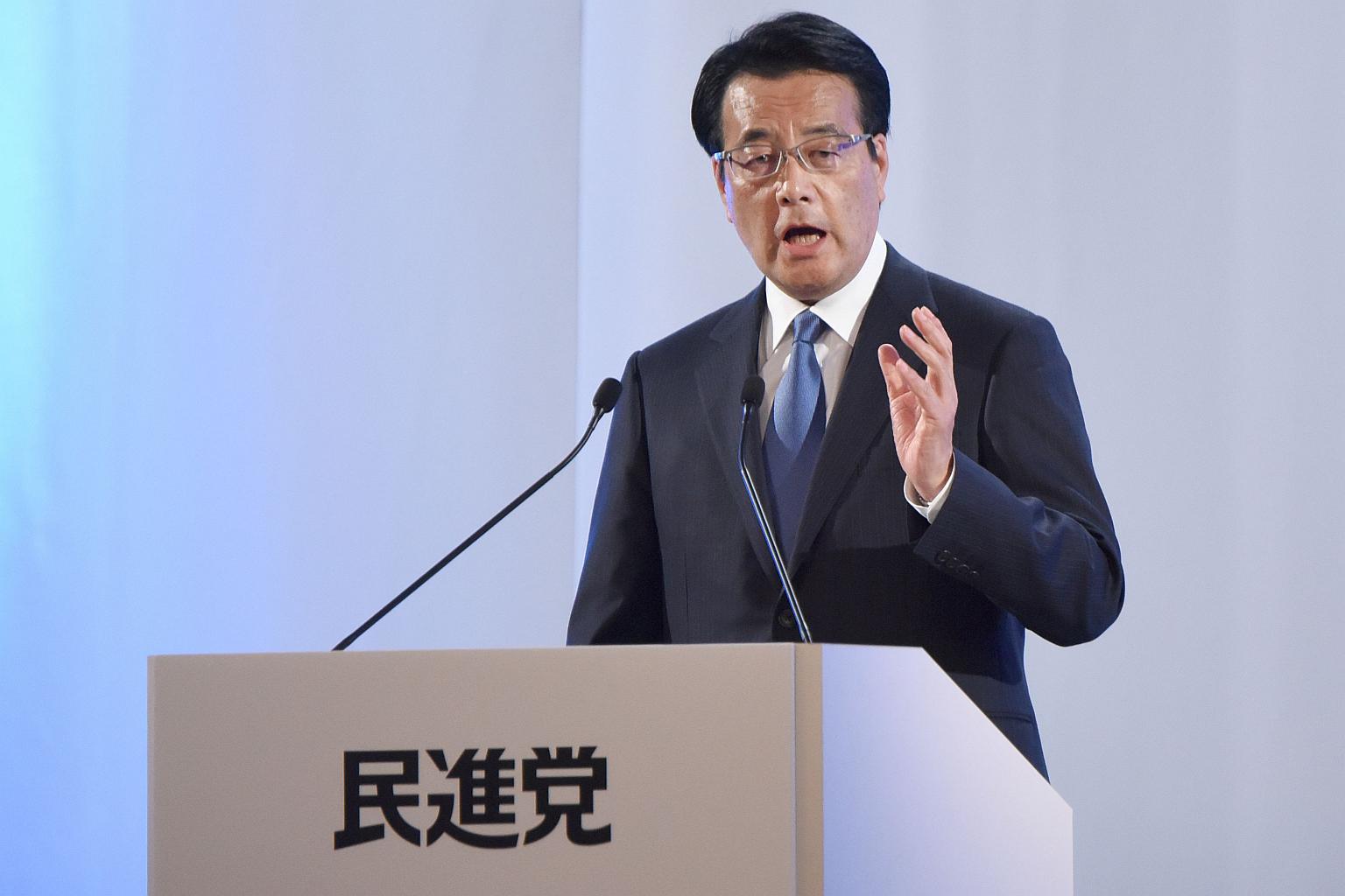 Leader of the main opposition Democratic Party Katsuka Okada makes a speech during the party's inauguration ceremony in Tokyo on March 27, 2016.