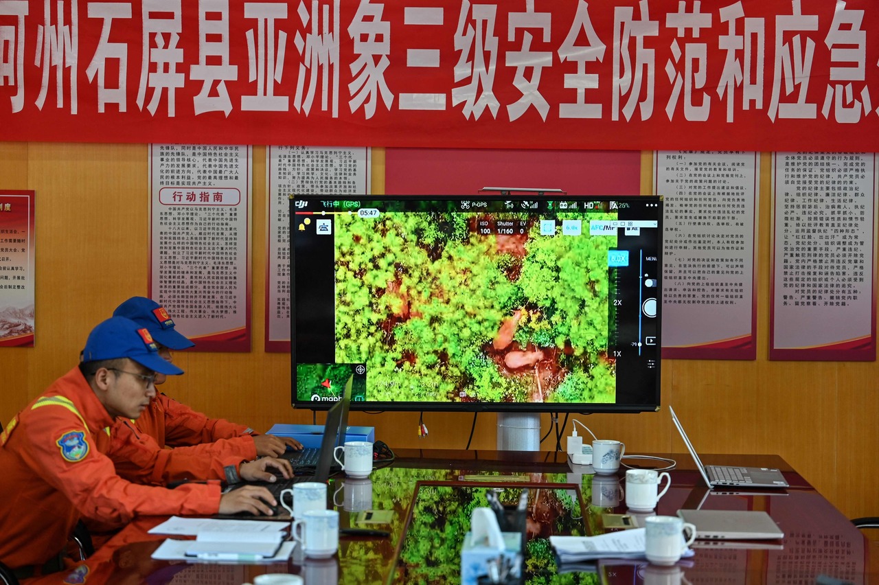 Members of the Yunnan Forest Brigade monitoring a herd of migrating elephants from the command centre in Daqiao in south-west China's Yunnan province.