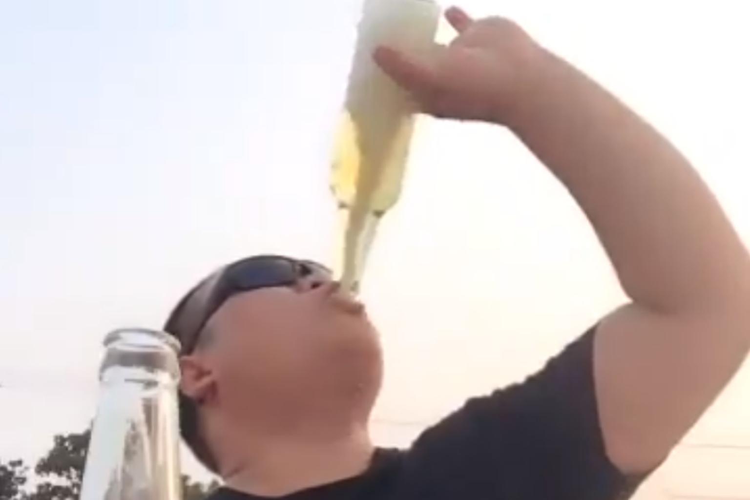 A small "tornado" forms in the bottle, and Hebei Pangzai, or "Fatty from Hebei province", as the 34-year-old is known on Twitter, drinks it all in seconds.