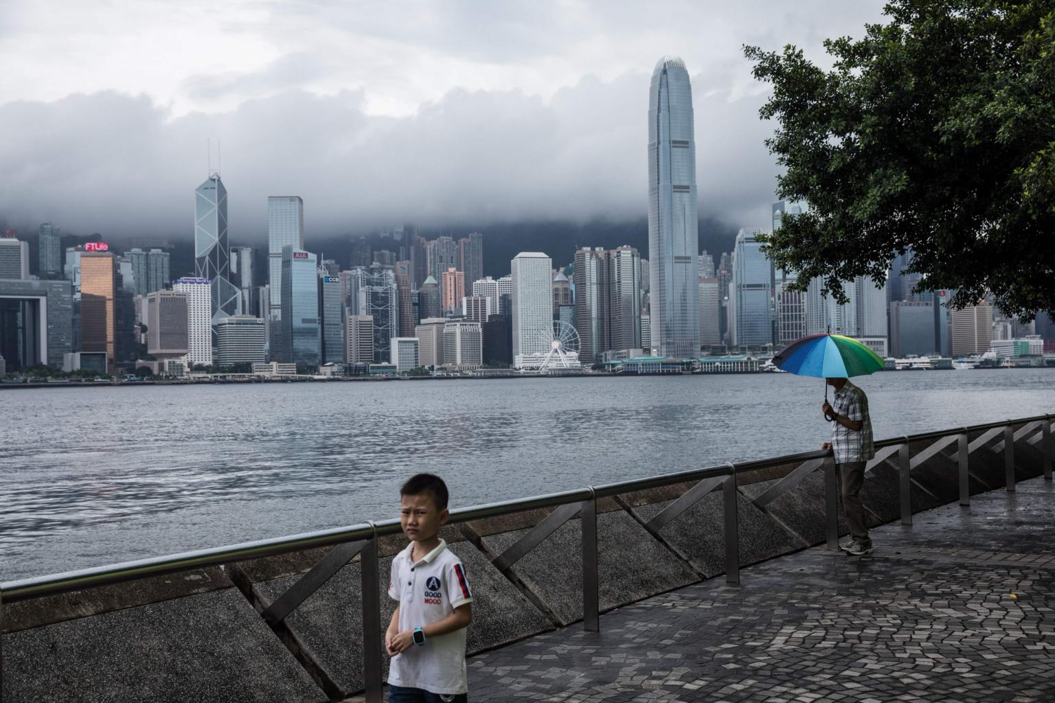 People walk along a promenade before the city skyline in Hong Kong, on July 23, 2017.