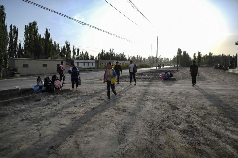 A photo taken on Sept 12, 2019 shows young students walking down a street in a small village in an ethnic Uighur area on the outskirts of Aksu in the region of Xinjiang, China.