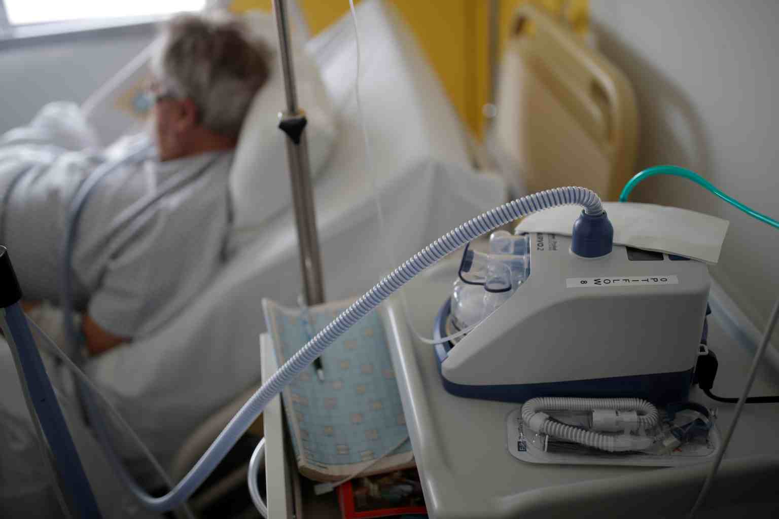 A nasal ventilator is pictured as a patient suffering from coronavirus is treated in a pulmonology unit at the hospital in Vannes, France, on March 20, 2020.