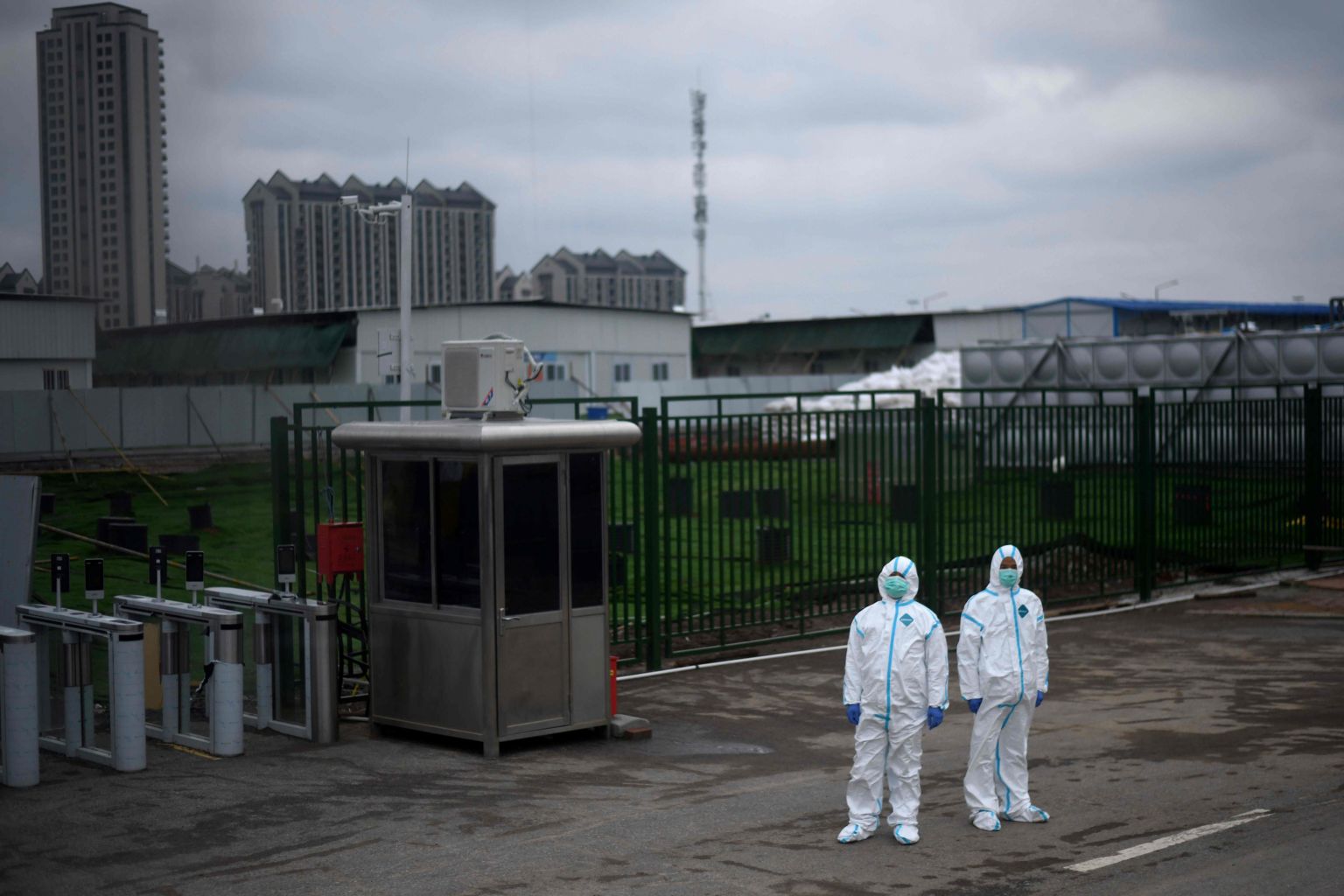 Security personnel stand in front of the Wuhan Leishenshan Hospital, on April 11, 2020.
