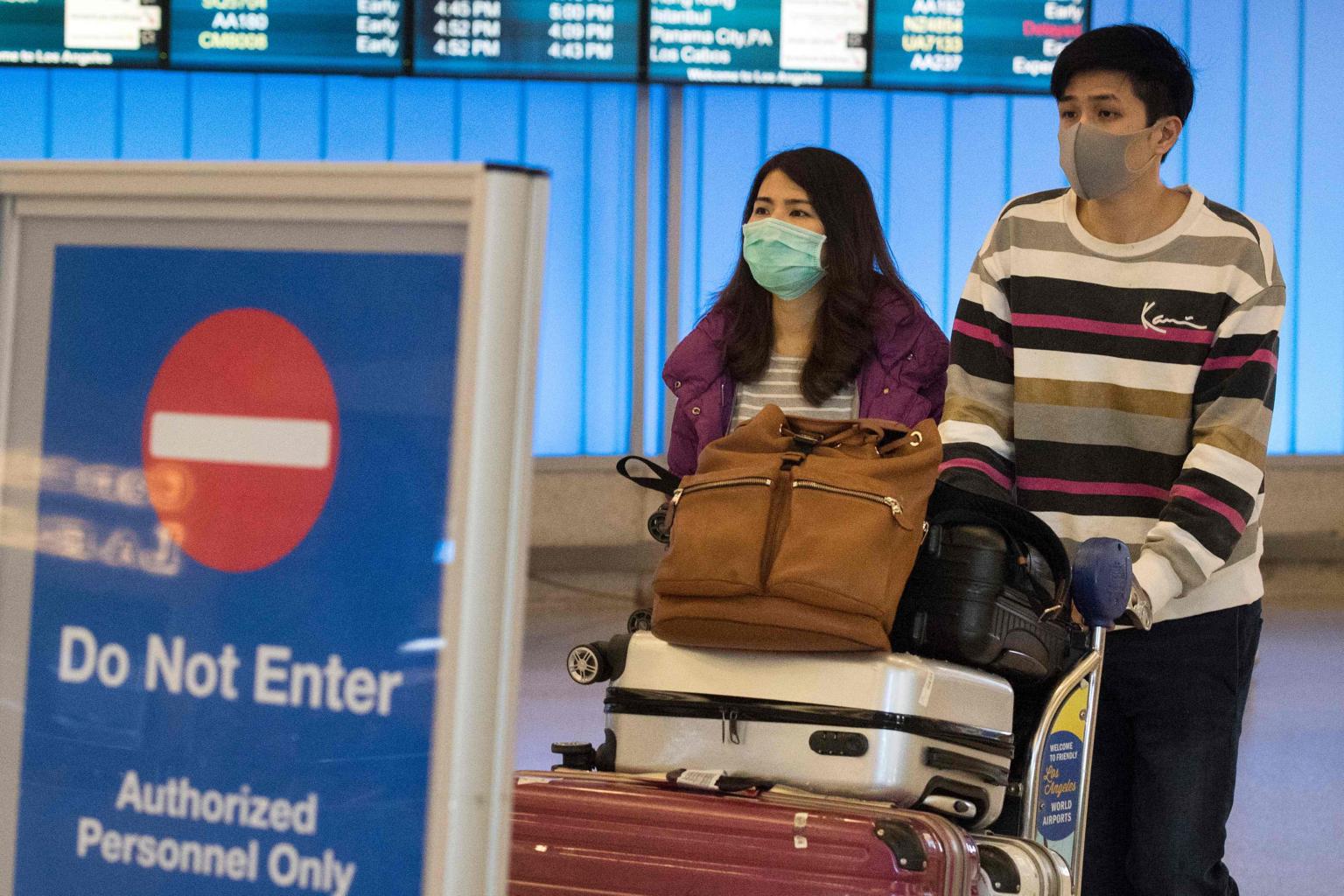 Passengers in protective masks arriving at the Los Angeles International Airport in California, on Jan 25, 2020.
