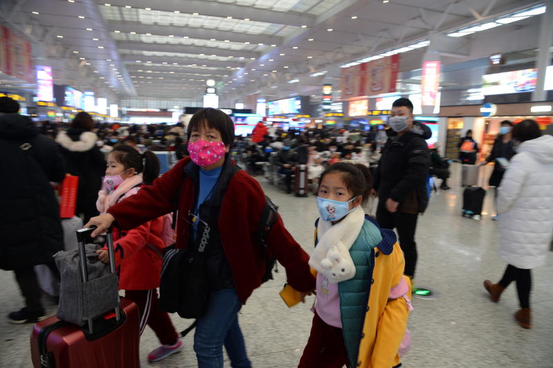 Passengers wear masks at the Hongqiao Railway Station in Shanghai on Jan 22, 2020.