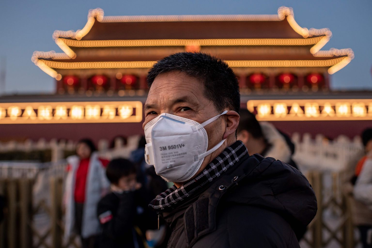A man wearing a protective mask looks on as he walks past Tiananmen Gate in Beijing.