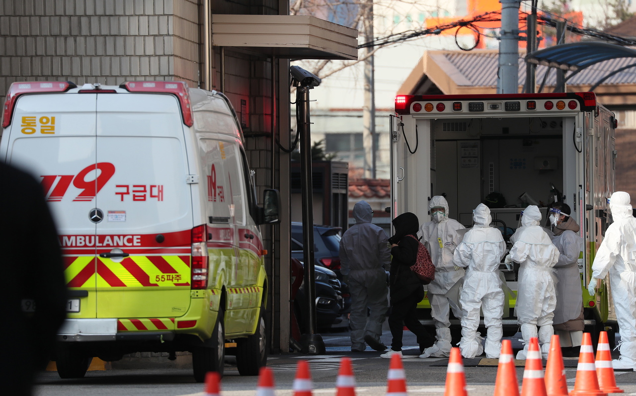 A South Korean evacuee from the coronavirus-hit Wuhan enters the National Medical Centre after showing symptoms of an infection, in Seoul on Jan 31, 2020.