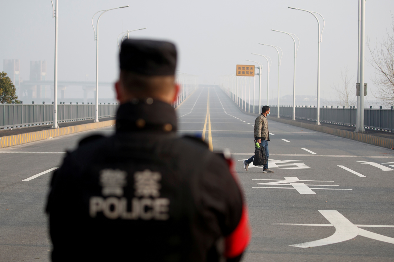 A man arriving from China's Hubei province approaches a checkpoint at the Jiujiang Yangtze River Bridge in Jiangxi province on Jan 31, 2020.