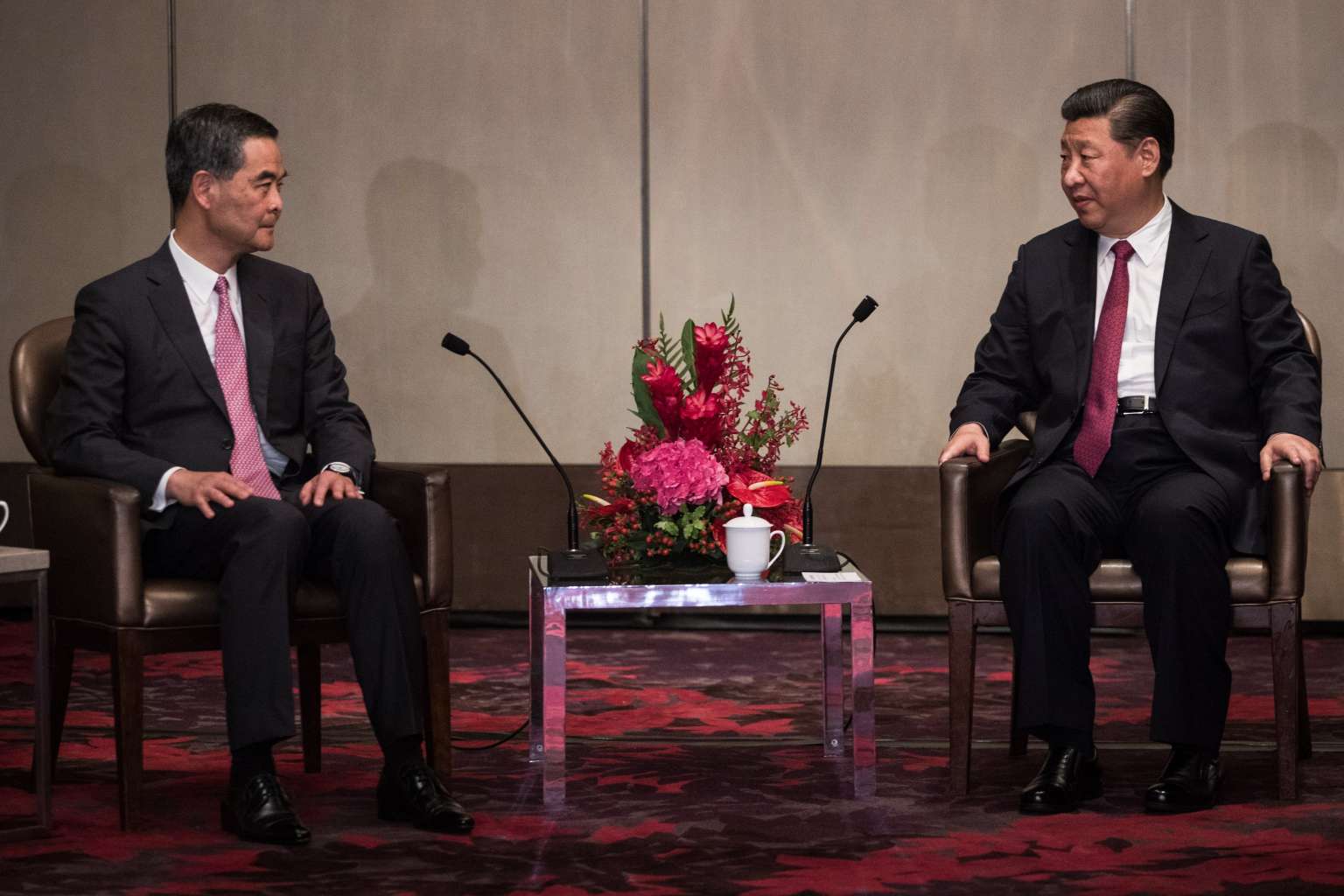 China's President Xi Jinping (right) speaking with Hong Kong Chief Executive Leung Chun-ying during a meeting at a hotel in Hong Kong on June 29, 2017.
