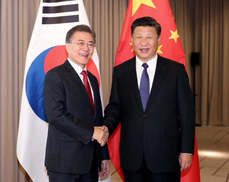 South Korean President Moon Jae In (L) and Chinese President Xi Jinping (R) pose for a photo prior to their talks at a hotel in Berlin, Germany, July 6, 2017. The two leaders are in Germany for the upcoming G-20 summit, which will be held in Hamburg from July 7-8.