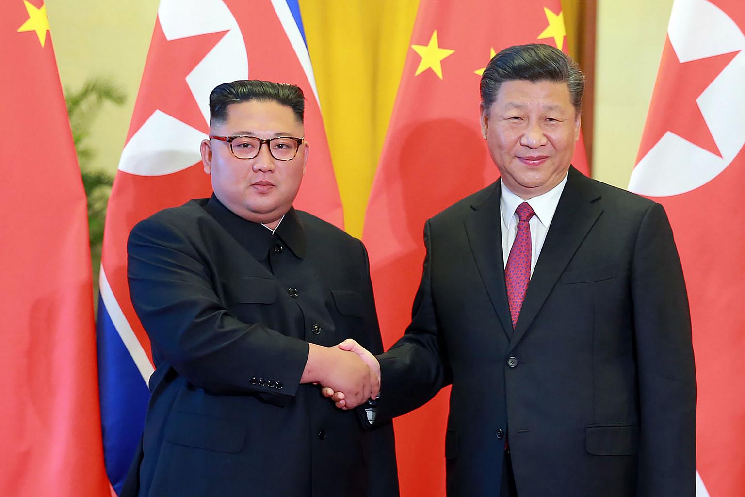 North Korean leader Kim Jong Un (left) shaking hands with Chinese President Xi Jinping at the Great Hall of the People in Beijing, on June 19, 2018.
