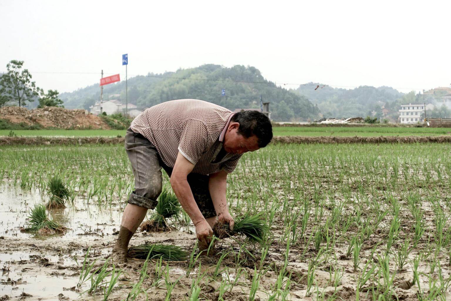 A farmer plants seedlings at a field in Dongfeng village, Hunan province, China, on May 9, 2018.