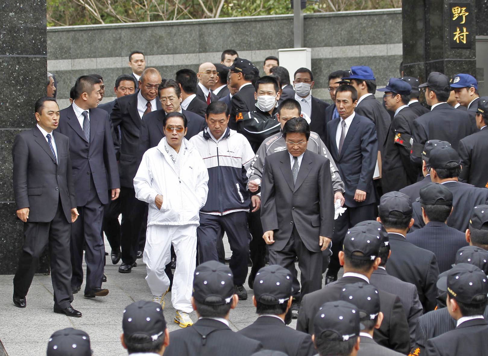 A photo from 2010 showing Kudo-kai head Satoru Nomura (in white) with Fukuoka police investigators during a raid of the gang's affiliate in Kitakyushu, Japan.
