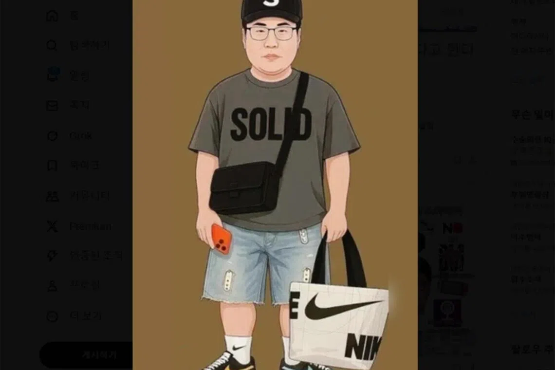 An illustration of a man in his 40s wearing a Supreme cap, an oversized logo tee, frayed mid-thigh shorts and Nike socks pulled high over matching sneakers recently went viral in South Korea.
