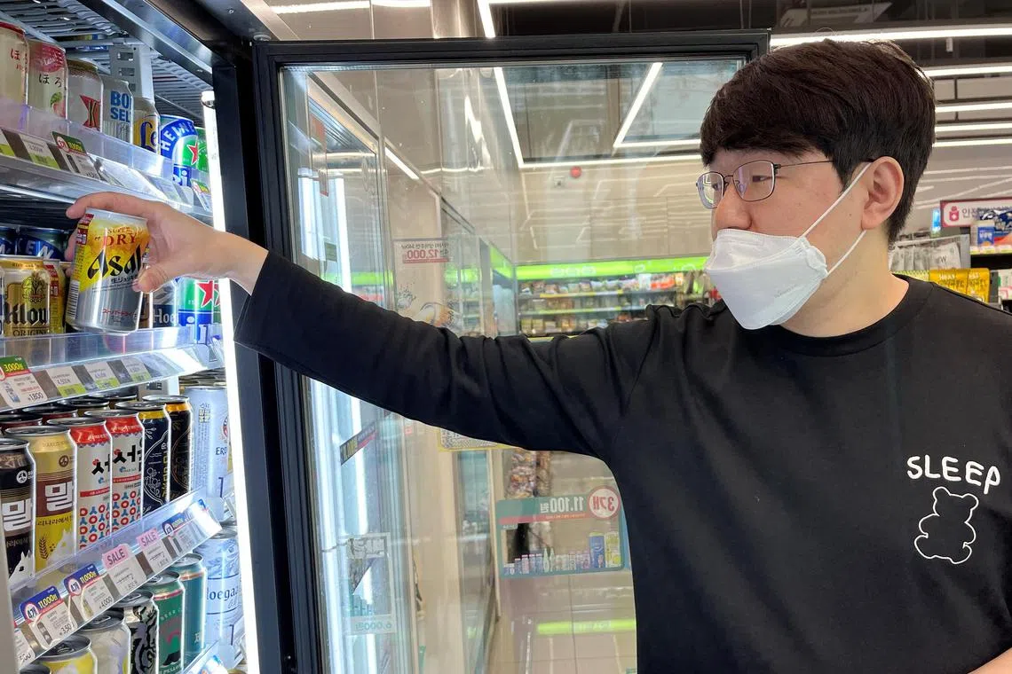 Mr Son In-seok picking up Asahi’s new super-dry draft canned beer at a convenience store in Seoul on May 12, 2023.