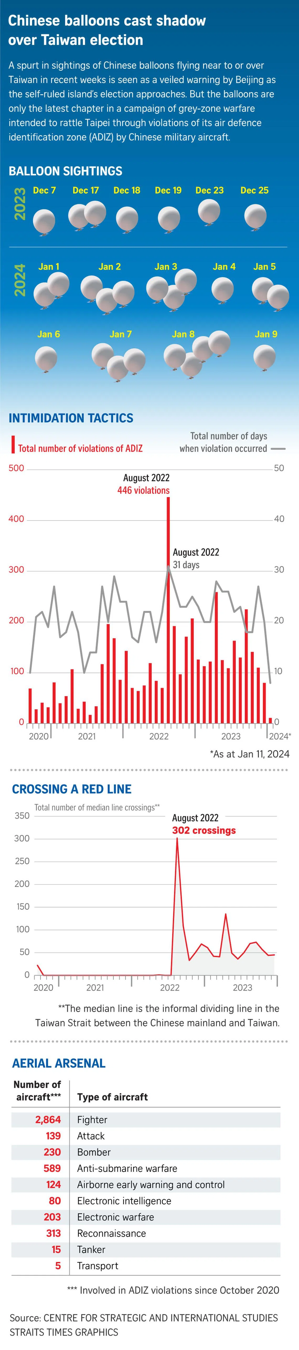 “The idea behind this is to test the defences of the island,” said Mr Kalpit A. Mankikar, a fellow at the Observer Research Foundation, a New Delhi-based think-tank. “This is classical grey-zone warfare, where you’re trying to ascertain how your opponent reacts to the sighting of these balloons.”