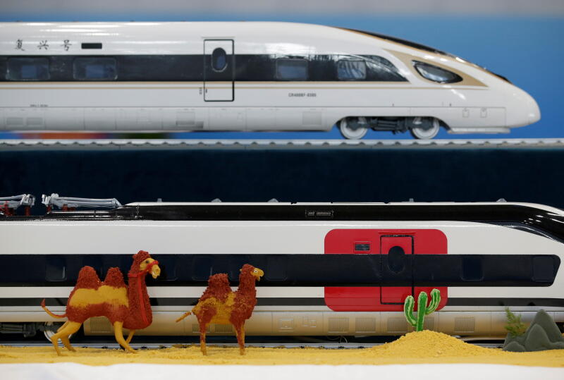 A photo from April 26, 2019, shows a replica of China Railway High-speed trains at a media centre for the second Belt and Road Forum in Beijing.