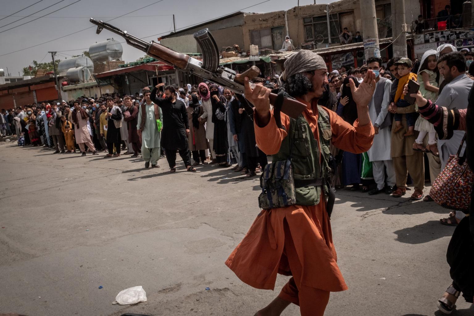 A Taleban fighter threatens a woman who was waiting to enter the airport with her family in Kabul on Aug 18, 2021.