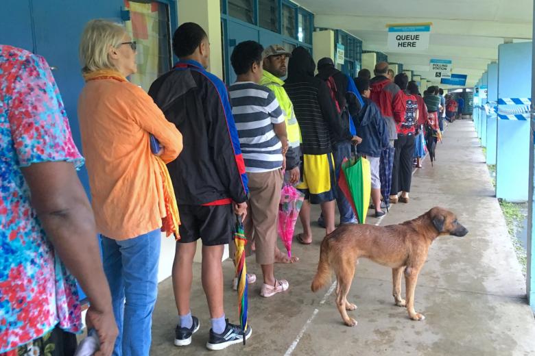 Voters wait in a line to enter a polling venue during voting for Fiji's general election near Suva, Fiji, on Nov 14, 2018.