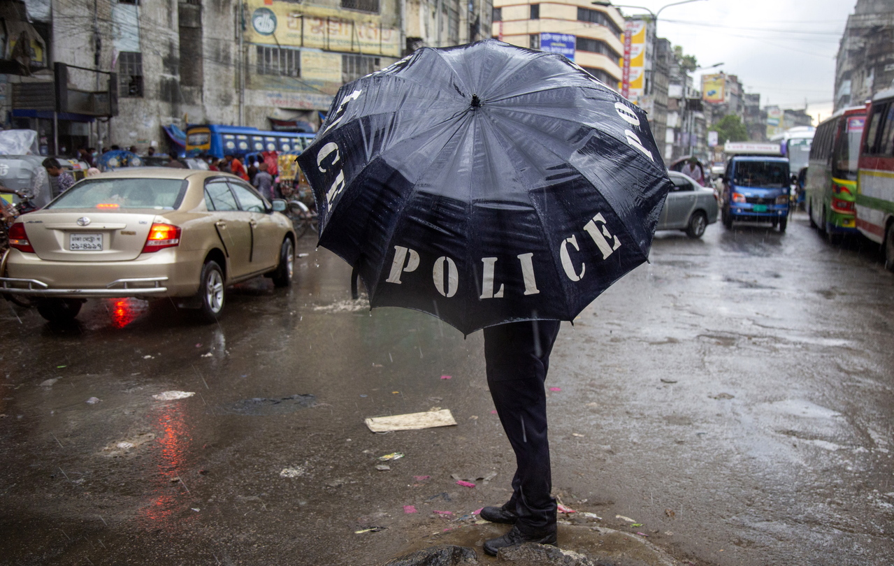 A traffic police officer takes cover under an umbrella on a rainy day in Dhaka, Bangladesh, on Sept 25, 2021.