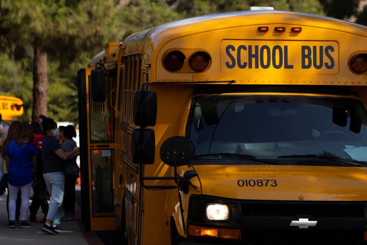 School buses line up outside Woodrow Wilson Senior High School as students return to in-person classes in Los Angeles, California, on Aug 30, 2021.