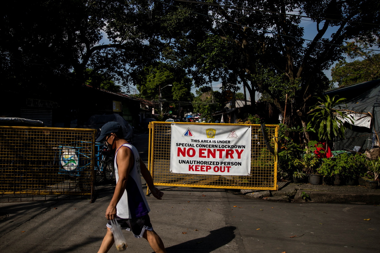 <p>A man walks past a street under a localised lockdown amid rising coronavirus disease (COVID-19) infections, in Quezon City, Metro Manila, Philippines, September 16, 2021. REUTERS/Eloisa Lopez</p>