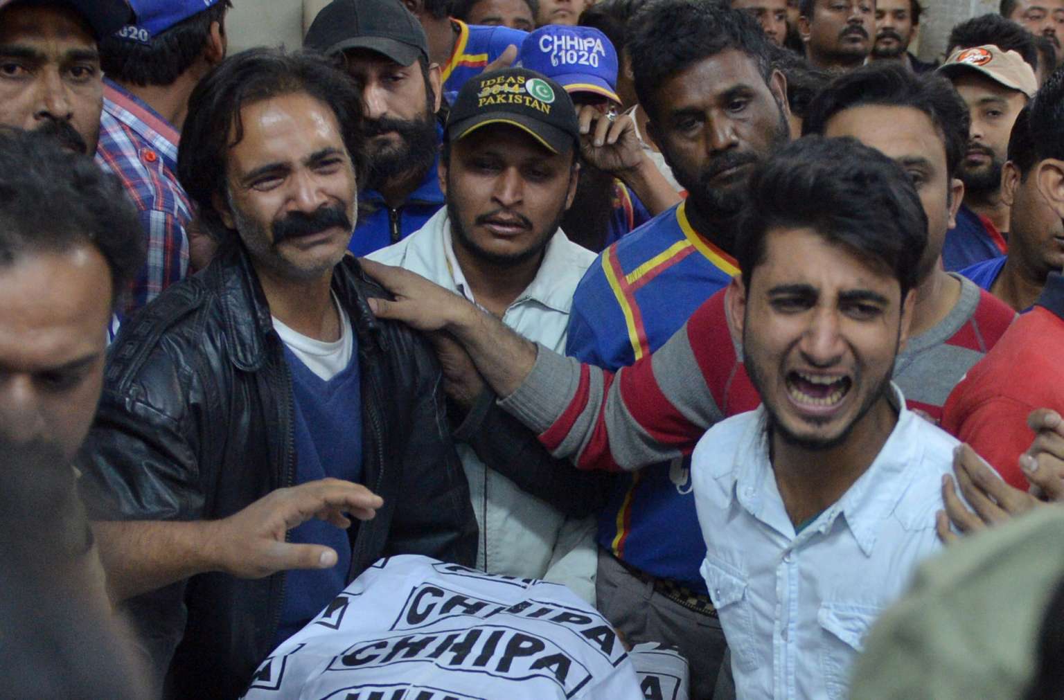 Relatives and colleagues mourn around the body of Taimoor Abbas, an employee of a Pakistani TV news channel, who was shot dead while reporting on an assault in Karachi on Feb 12, 2017.