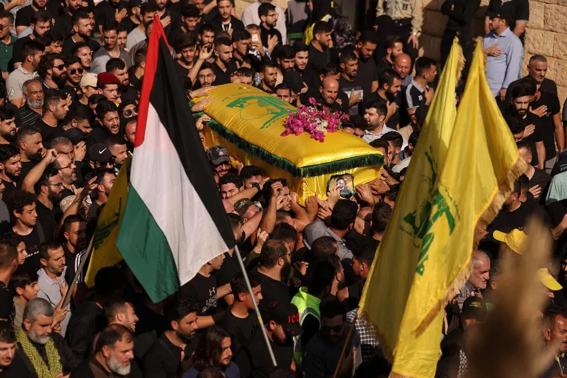 People carrying the coffin of a Hezbollah member killed in Lebanon amid tensions between Israel and Hezbollah.