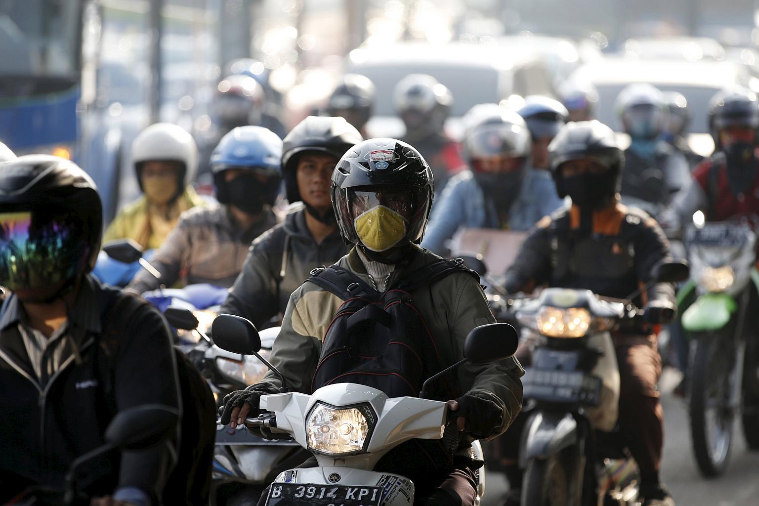 Motorcyclists on a road in Jakarta.