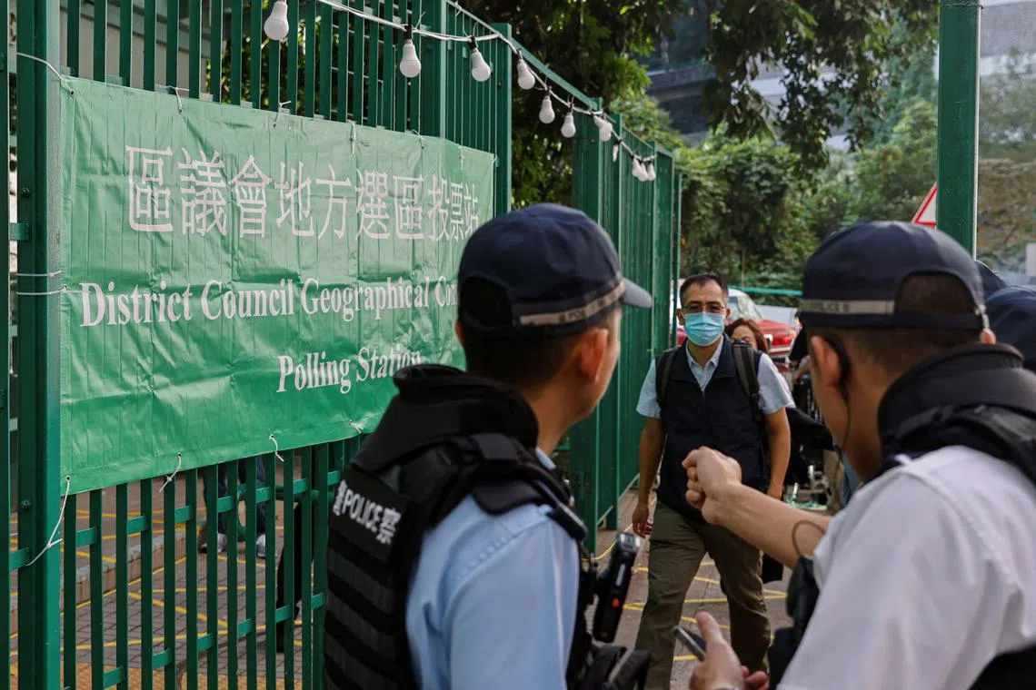 Police stand guard outside a polling station during the District Council election in Hong Kong on Dec 10.