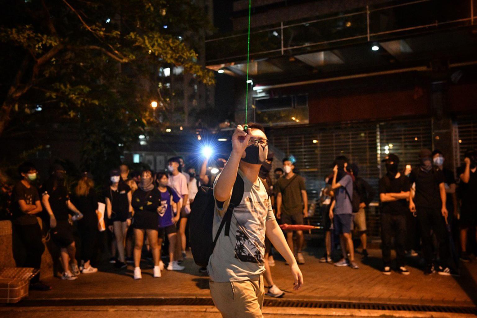 A protester points a laser pointer at Ma On Shan Police Station on Oct 9, 2019.