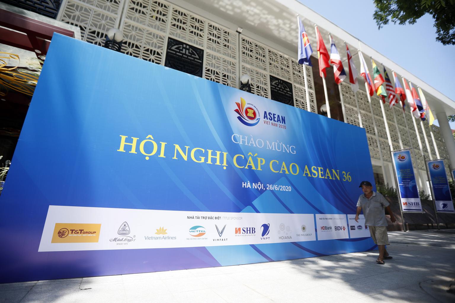 A man walks in front of a billboard promoting the upcoming 36th ASEAN summit in Hanoi on June 22, 2020.