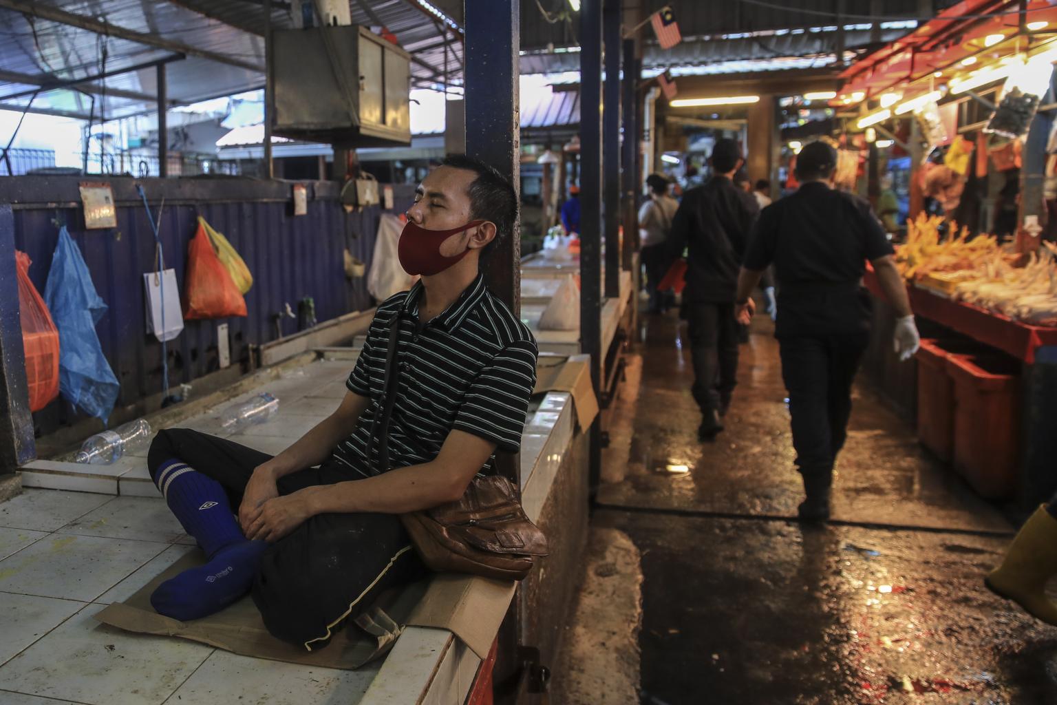 A vendor sleeps while waiting for customers at the wet market in Kuala Lumpur, Malaysia, on April 10, 2020.