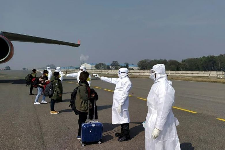 New Delhi airport officials conduct temperature checks on passengers arriving from Wuhan on Feb 2, 2020. India is now also screening passengers on flights coming in from Singapore and Thailand.