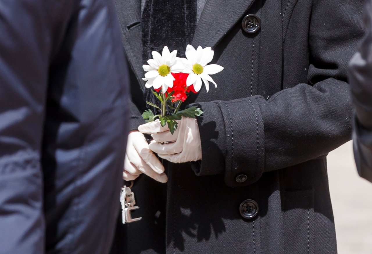 A man wearing gloves holds flower during the burial of a man who died of the new coronavirus at the South Municipal cemetery in Madrid, Spain, on March 23, 2020.